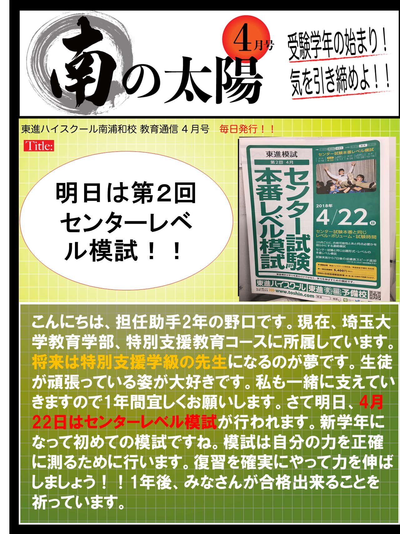 2018年 4月 21日 明日はセンターレベル模試!!